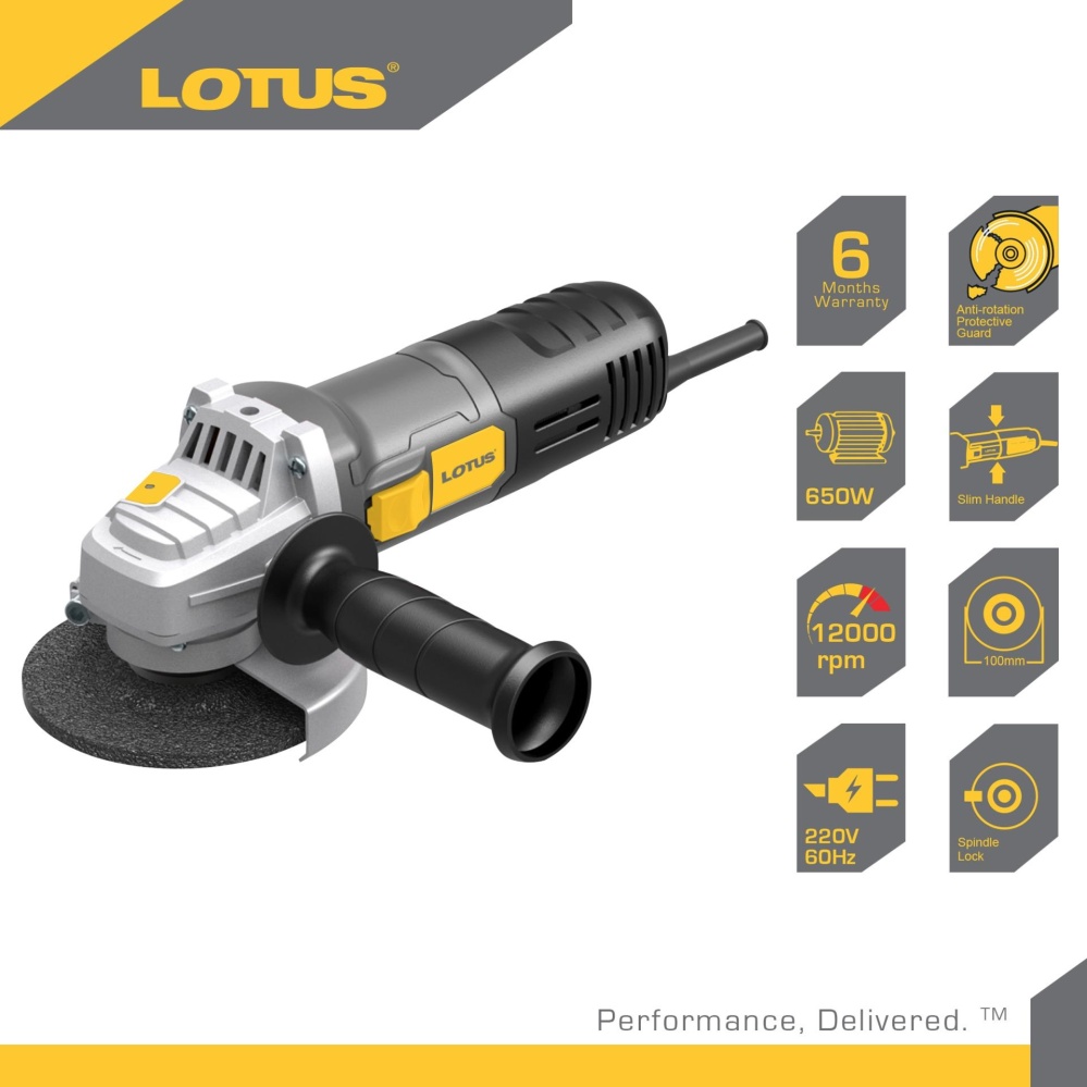 1 x Lotus LAG115Z1 Angle Grinder 650 Watts; 1 x Flange set; 1 x Wrench; 1 x Disc; 1 x User Manual; 1 x Warranty Card